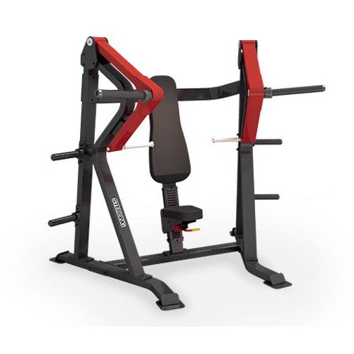 Plate loaded equipment for working out pectoralis major muscle. The exerciser could effectively stimulate pectoralis major muscle through pushing press arm after loading appropriate weight.