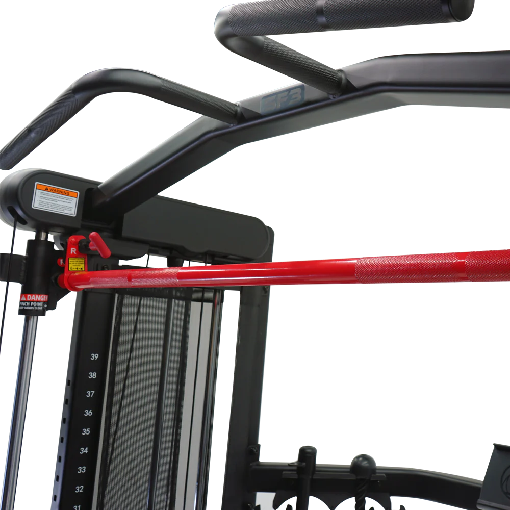 The Inspire Fitness SF3 Smith Functional Trainer is a two-in-one home gym. Built with dual 165 lb weight stacks, 2 sliding adjustable pulleys, a pull up station, and fully integrated Smith Bar. It also comes equipped with a complete accessory package of 7 attachments, storage for your device, and storage for all of your accessories. The frictionless cable and pulley system allows for almost any dynamic movement while our innovative, integrated Selectorized Smith Bar system elevates traditional strength training to new personal bests. No plates or spotter are needed with this machine as the Smith Bar utilizes the weight stacks and has built-in safeties.
