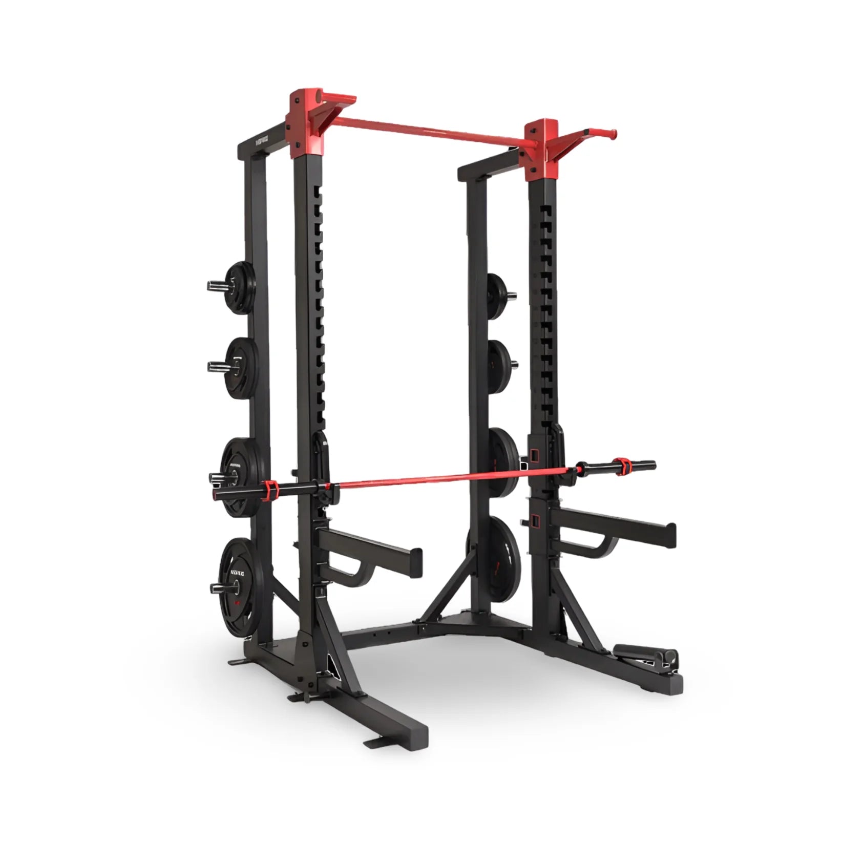 The Ultimate Commercial Half Rack is designed for durability and versatility. Equipped with a wide pull-up bar, adjustable safeties, J-hooks, dip handles, a landmine attachment, and band attachments, it's perfect for all your strength training needs.