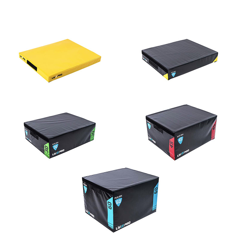 The multifunctional LivePro Plyo Box is the perfect piece of gym equipment to enhance your explosive power. Five soft boxes of different heights can be combined and used in any combination or individually. They are excellently designed with bright colours to ensure you can correctly identify your preferred size. The inner portions are filled with pearl cotton, the surfaces are wrapped in PVC material, and strong velcro is used to ensure staking stability.