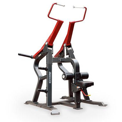 Plate loaded equipment for working out latissimus dorsi muscle. The exerciser could effectively stimulate latissimus dorsi muscle through pulling pulldown handle after loading appropriate weight.