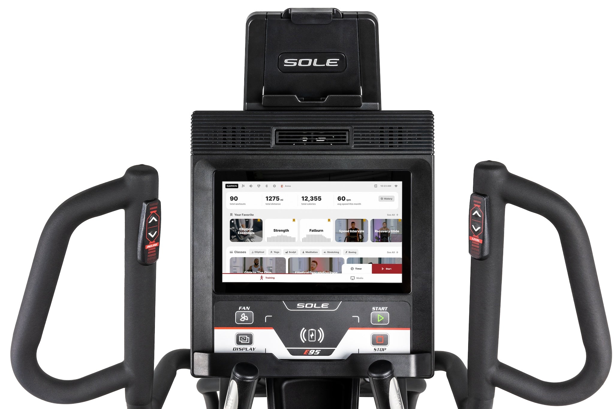 The award-winning Sole Fitness E95 Elliptical is packed with advanced features, including a 13.3″ touchscreen display with WIFI, screen mirroring, and a wireless charger.